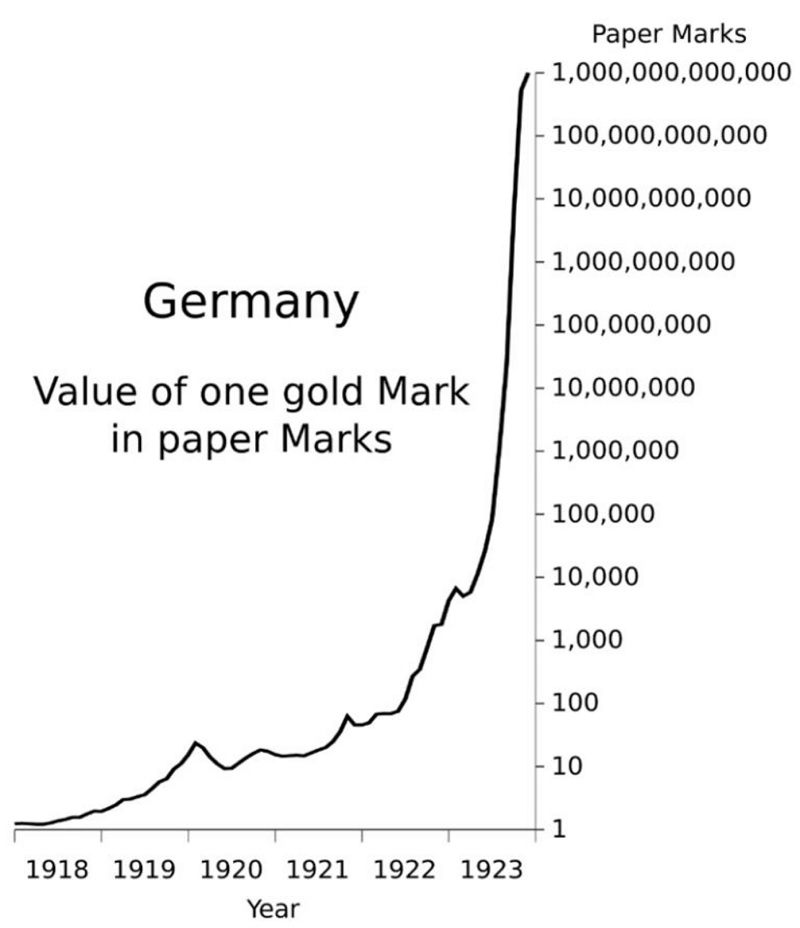 Le graphique ci-dessus illustre comment, durant la tristement célèbre hyperinflation de l’Allemagne de Weimar au début des années 1920, l’or physique, tel qu’une pièce de Mark d’or, a non seulement conservé sa valeur, mais a également grimpé en flèche lorsqu’il a été évalué en marks papier, alors en rapide dépréciation. Cela s’est produit parce que la Reichsbank, la banque centrale allemande, faisait tourner la planche à billets à plein régime pour soutenir une économie en plein effondrement et combler d’énormes déficits publics.