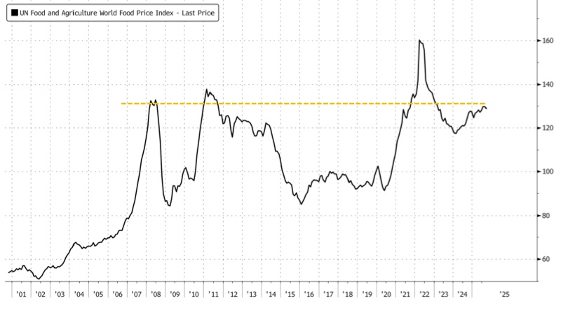 Par Tyler Durden – Dans un nouveau rapport, l’Organisation des Nations unies pour l’alimentation et l’agriculture (FAO) souligne que les prix élevés des denrées alimentaires persistent dans le monde entier, citant des données qui montrent une multiplication par cinq dans de nombreux pays. Cette hausse exponentielle crée des conditions propices à des troubles sociaux, en particulier dans les pays en développement ou politiquement fragiles. Nous avons déjà connu cette situation, du « Printemps arabe » à la crise alimentaire de 2007-2008, et cela nous rappelle que les turbulences mondiales sont loin d’être terminées.