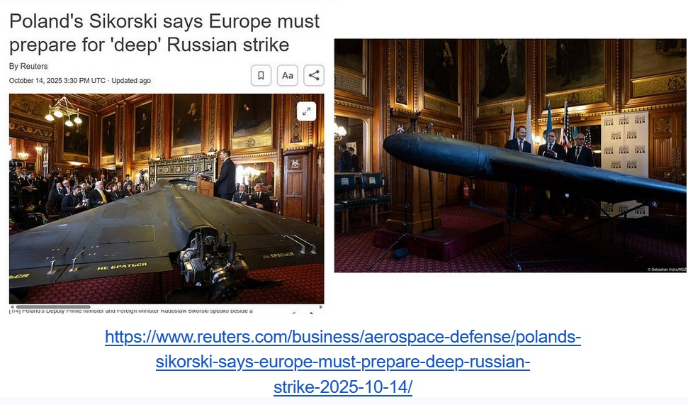 Prenez par exemple la visite du ministre polonais des Affaires étrangères Sikorski à Londres aujourd’hui, où il a mis en scène un drone russe Geran capturé dans la sanglante Chambre des communes du Parlement britannique pour un effet théâtral maximal :